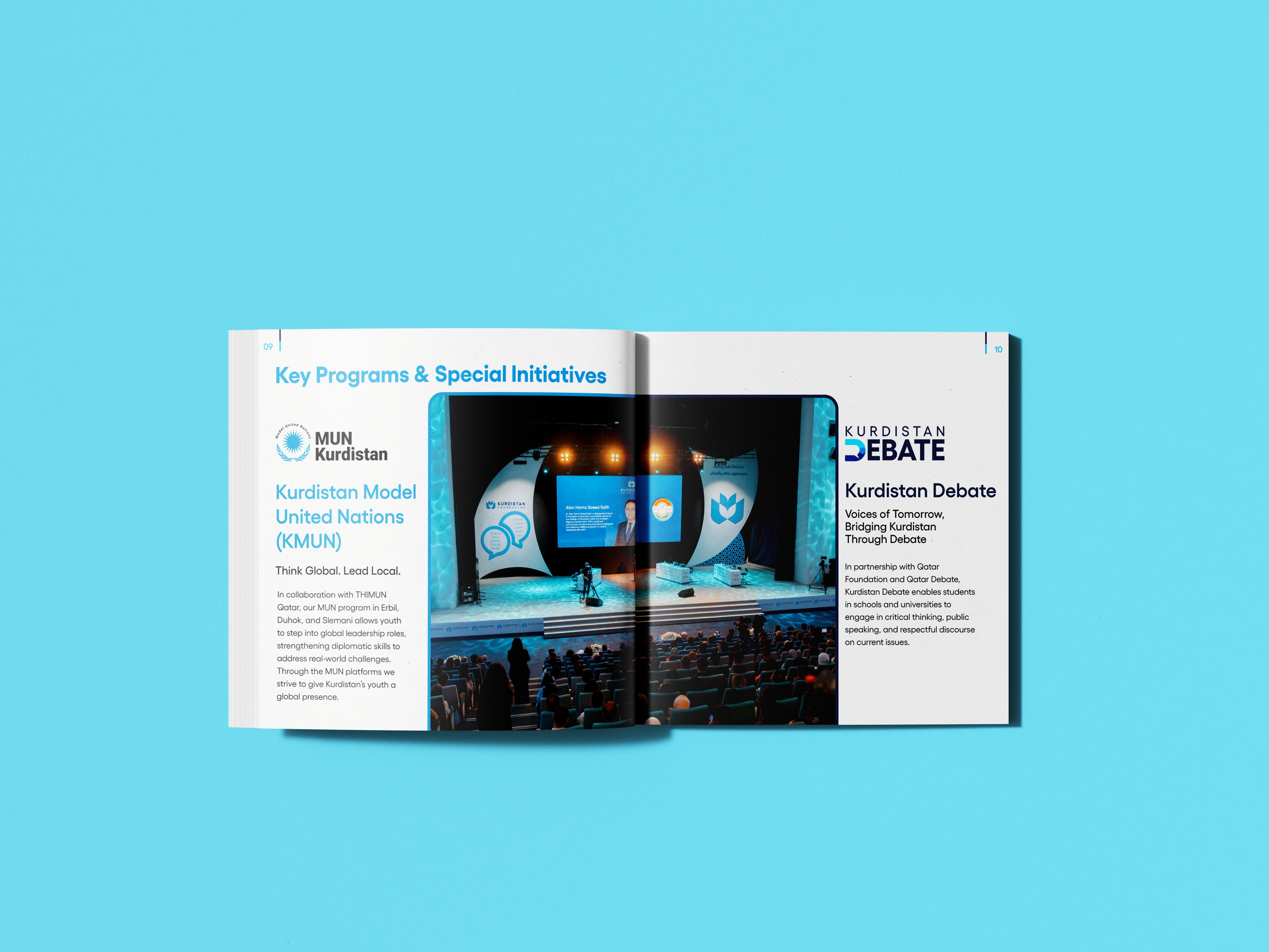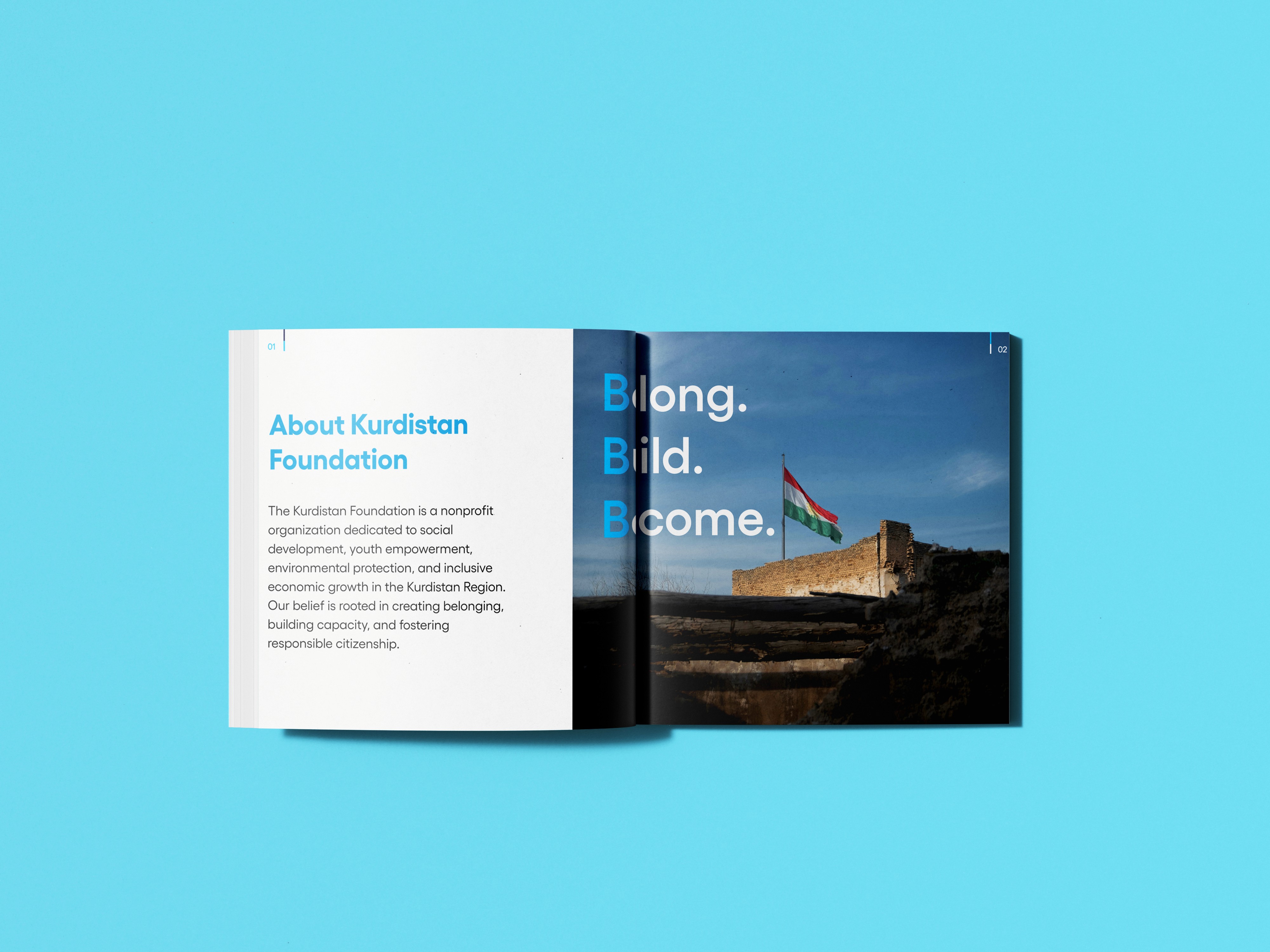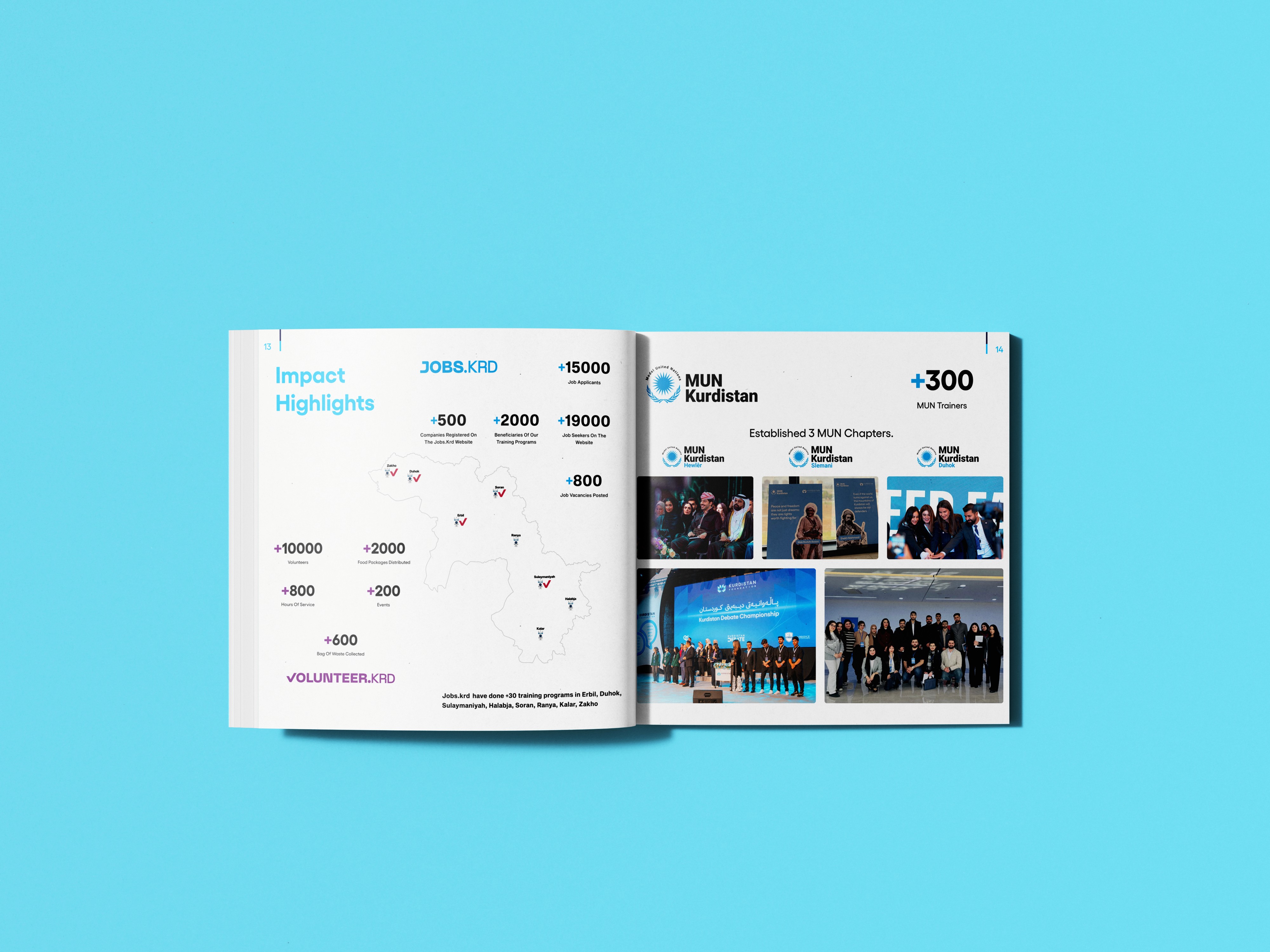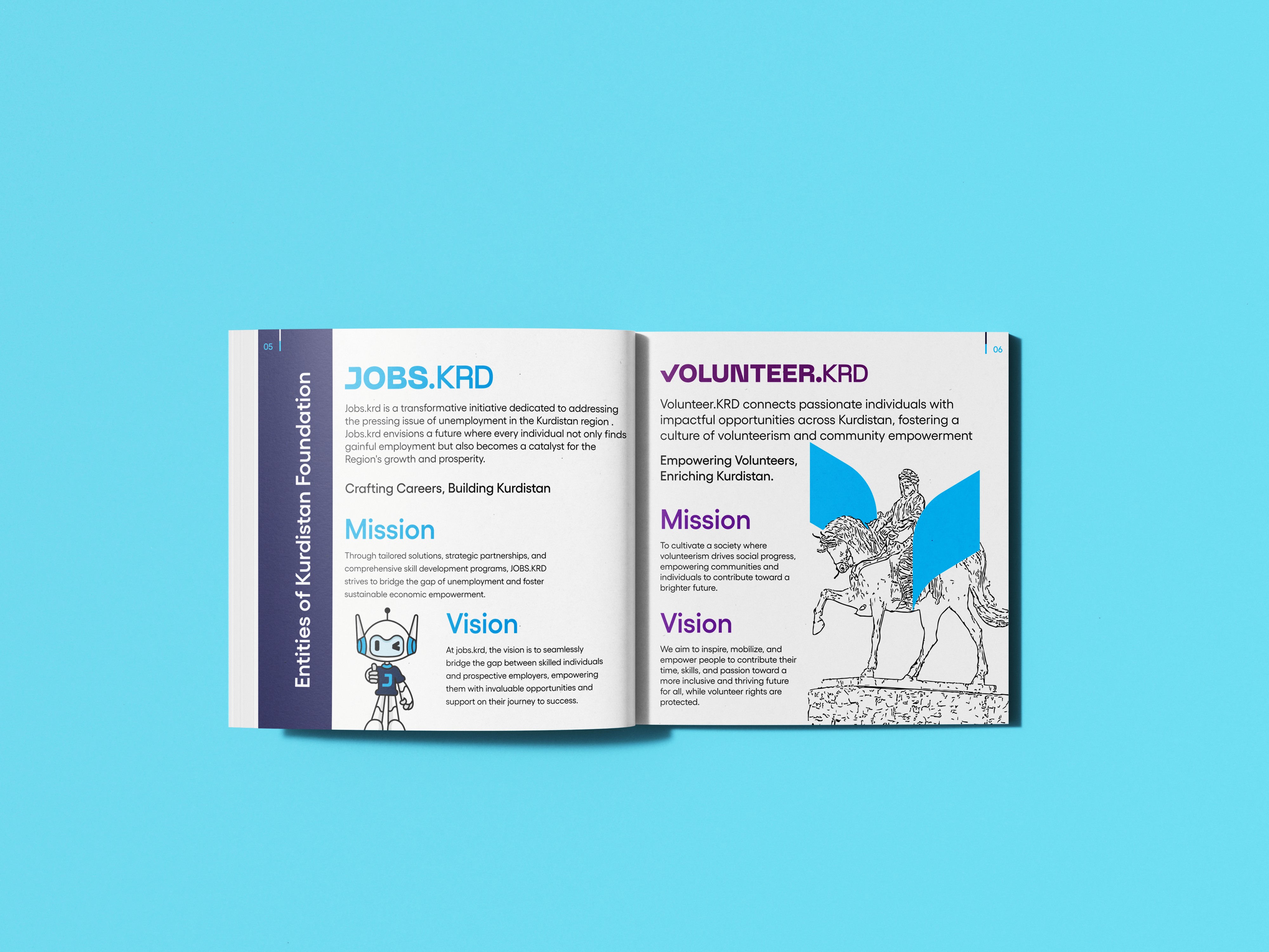The challenge was more than just layout—it was about telling a story that resonates with both local and international partners. I developed a modular visual system that showcased KF’s diverse programs (Jobs.krd, Volunteer.krd, Empower.krd, Climate.krd), making complex impact data and values feel simple, engaging, and powerful.
